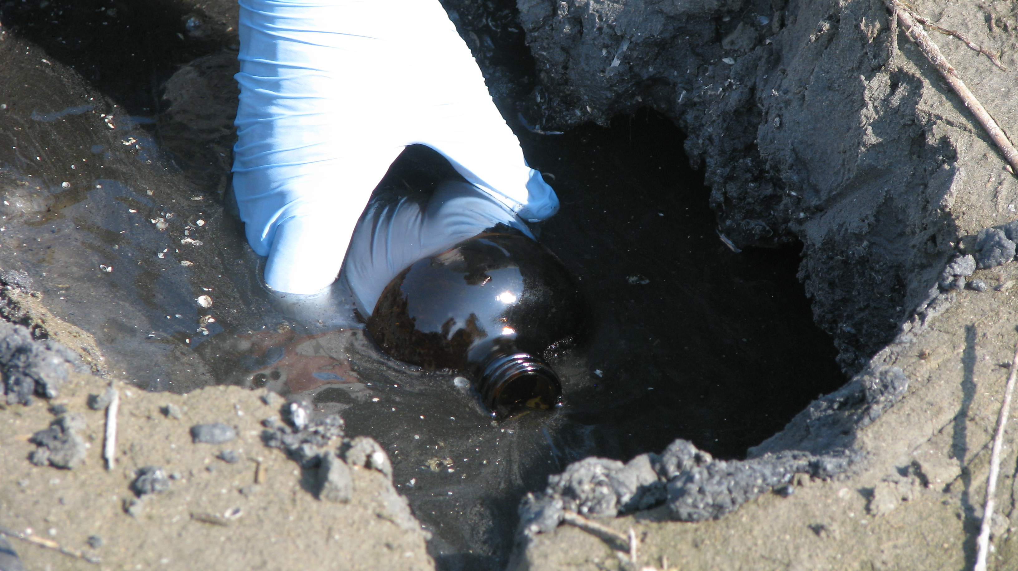 In this picture, we see a sample being taken from about 18 inches under the beach surface, about 25 feet in from the shore on a small island east of Grand Isle, Louisiana. Notice the dark streaks throughout the water.