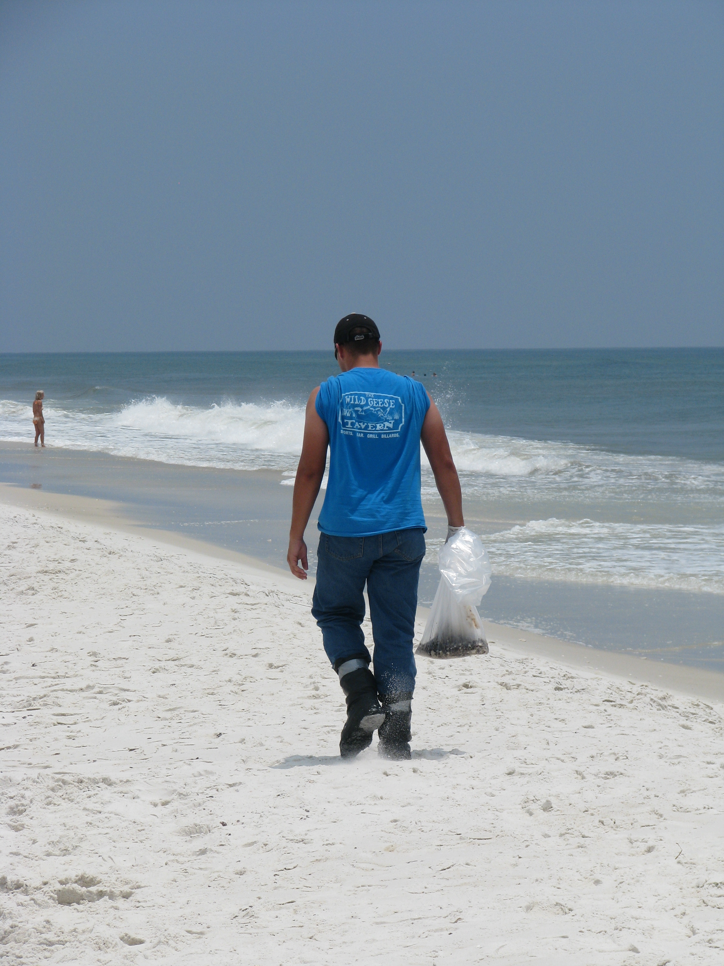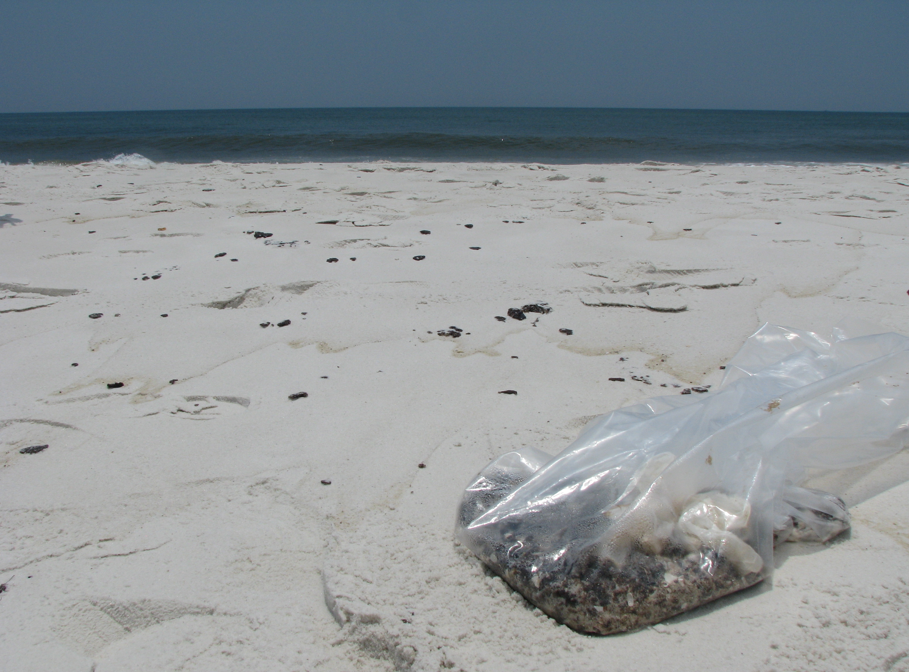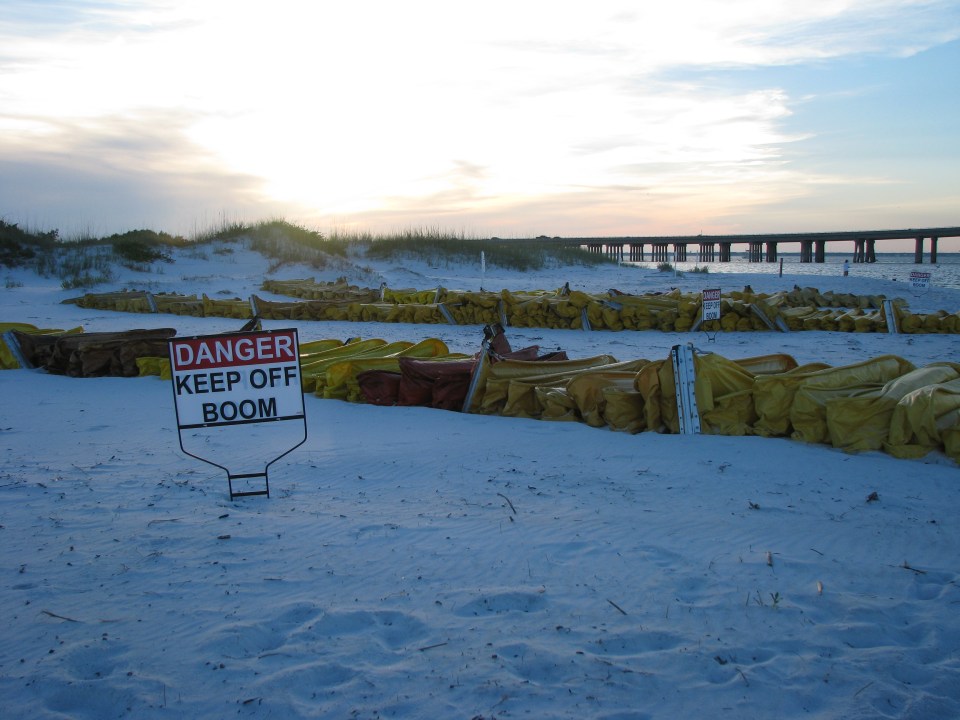 Bag of debris left by cleanup workers in Pensacola, FlOil lines the beach in PensacolaA cleanup worker clears oil debris in Pensacola, FlBooms await their placement in Destin, FlBooms line the shore in Destin, Fl